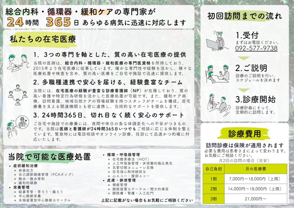 | 診療内容 | 内科/循環器内科/緩和ケア内科 ・ 訪問診療 ・ 外来診療(完全予約制) |